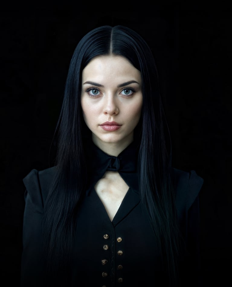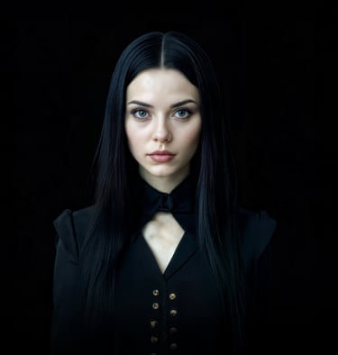 Appearance: 1.80 m tall, very slim, has long, shiny, raven-black hair smoothly parted in the middle, fair complexion, always dressed in black.